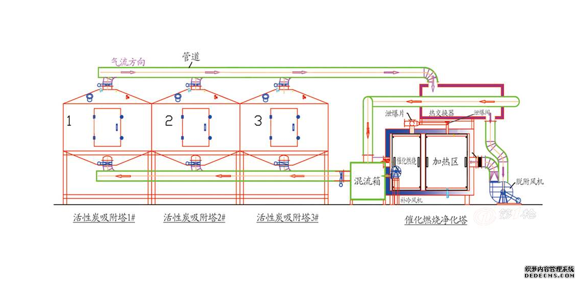 RCO催化燃燒設備將符合吸附條件的有機廢氣送入活性炭吸附箱進行吸附凈化,凈化后的潔凈氣體由主排風機排入大氣中。吸附裝置配有備用吸附箱1套,當活性炭吸附飽和后通過控制閥門切換至催化燃燒脫附狀態;脫附再生系統采用在線脫附再生(也可采用離線脫附再生),即吸附過程為連續式處理工藝,在備用吸附裝置投入使用同時,飽和吸附箱則進行脫附工作,脫附后活性炭箱預備至下次循環使用。